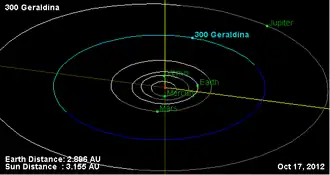 300 Geraldina is a large Main belt asteroid.[1] It was discovered by Auguste Charlois on October 3, 1890, in Nice. The origin of the name is unknown.[2] It is orbiting the Sun at a distance of 3.21 AU with a period of 5.74 yr and an eccentricity (ovalness) of 0.057. The orbital plane is tilted at an angle of 0.73° to the plane of the ecliptic.[1]