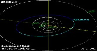 320 Katharina is a small Main belt asteroid orbiting in the Eos family of asteroids, including 513 Centesima and 221 Eos.[1] It was discovered by Johann Palisa on 11 October 1891 in Vienna. It is named after the discoverer's mother.[2]