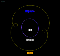 Huya is a trans-Neptunian object (TNO) in a 2:3 mean-motion orbital resonance with Neptune, meaning that Huya completes two orbits around the Sun for every three orbits completed by Neptune.[2] Due to its 2:3 orbital resonance with Neptune, Huya is classified as a plutino, a dynamical class of objects with orbits similar to that of Pluto.[15] Huya orbits the Sun at an average distance of 39.4 AU (5.89 billion km; 3.66 billion mi), taking 247 years to complete a full orbit.[5][f] Huya's orbit is inclined to the ecliptic by 15.5 degrees, slightly less than Pluto's orbital inclination of 17 degrees.[1][29] It has an elongated orbit with an orbital eccentricity of 0.28. Due to its eccentric orbit, its distance from the Sun varies over the course of its orbit, ranging from 28.5 AU at perihelion (closest distance) to 50.3 AU at aphelion (farthest distance).[1] Like Pluto, Huya's orbital resonance prevents close approaches to Neptune.[30] The minimum orbit intersection distance (MOID) between Huya and Neptune is approximately 1.4 AU,[4] but due to the resonance, the two never come closer than 17 AU of each other.[31]