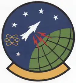 1. ^ Approved 20 April 1976. Description: A blue disc edged with a narrow black border on which is a green demi-globe issuing from sinister base with axis bendwise grid-lined black below an arced pattern of five white five-pointed stars and a yellow atomic symbol, above the globe a stylized white missile ascending bend sinisterwise emitting three red lightning flashes surmounting the upper portion of the globe. Attached below the disc a blank yellow scroll edged black. Significance: The missile represents the unit's function, and the atomic symbol its nuclear technology. The three lightning bolts symbolize the missile's speed, power, and strike capability, and the grid and sky are emblematic of the unit's global capability. The five stars represent the unit's World War II participation in five campaigns.