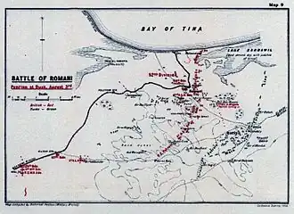 The Gallipoli Campaign was shut down at the beginning of January, but 42nd (EL) Division remained on Mudros for some time before returning to the Egyptian Expeditionary Force (EEF) and the Suez Canal defences. From February to 1916 it was stationed at Shallufa, base for the Southern Sector of the defences, broken by spells of training in the desert. In June the division was moved to the Central Sector, between Ismailia and Kantara. 1/5th and 1/8th Manchesters were stationed with 126th (East Lancashire) Bde between El Ferdan and Abu Uruk. In July, 42nd (EL) Division became part of a Mobile Column (under Maj-Gen Hon Herbert Lawrence, former brigadier of 127th Bde) formed to counter a threatened Turkish thrust across the Sinai desert before it reached the canal. 127th Brigade was the advanced brigade of this force, and 1/5th Manchesters moved up from El Ferdan to rejoin. The Battle of Romani opened early on the morning of 4 August, and 127th Bde was rushed up to support the Anzac Mounted Division, which was heavily engaged. 1/5th and 1/7th Manchesters led off, through heavy sand in intense heat, and extended into line when 2,000 yards (1,800 m) from the Turks, 1/5th Bn on the right, to attack Mount Royston. However, seeing fresh troops arriving and the Anzacs remounting their horses, the Turks fled or surrendered. The brigade had moved so fast that it left its transport behind, but that night the camel transport carried vital water and supplies up to the front line troops. During 5 and 6 August the brigade pursued the defeated Turkish force, suffering badly from extreme heat and lack of water, with many men falling out through exhaustion, until it reached Qatiya.[19][20][21][22][23][43][44]