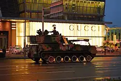 A PLZ-89 self-propelled howitzer passes the Shin Kong Place Luxury shopping centre during a training exercise, Beijing.