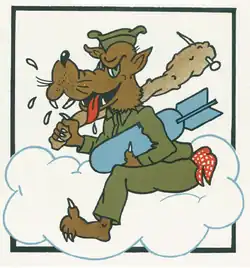 1. ^ Approved 24 July 1943. Description: On a white rectangle, long axis vertical, border black, a caricatured brown wolf in khaki work uniform, astride a large white cloud formation in base, edged light blue, carrying a large knotty club tan with spike through end, in right hand, and carrying a blue aerial bomb under the left forepaw; red polka dot handkerchief in hip pocket.