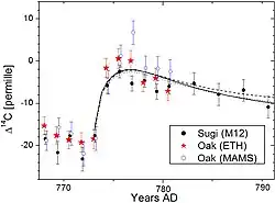 The carbon-14 spike around 774. Colored dots are measurements in Japanese (M12) and German (oak) trees; black lines are the modeled profile corresponding to the instant production of carbon-14.[2]