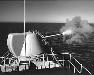 Gunfire support from cruisers and battleships had become an established part of United States amphibious warfare doctrine during World War II. As the last of the wartime cruisers and battleships were decommissioned, the 127 mm (5")/54 caliber gun became the largest available for such assignments. The 127 mm naval guns could fire a 70-pound (32 kg) projectile approximately 15 miles (24 km). In comparison, the 8"/55 caliber guns could fire a 260-pound (120 kg) projectile approximately 17 miles (27 km).[3]