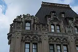 The top three stories consist of a copper-clad mansard roof.[29] There are dormer screens containing small balconies on the 21st floor, while the 22nd and 23rd floors contain dormer windows. These windows are covered by polygonal dormer roofs.[37] Above the 23rd floor is an asphalt roof surface containing mechanical equipment as well as bulkheads.[38] The dormers, as well as decorative tourelles, added to the aesthetic of the building when it was originally viewed from the waterfront.[21]