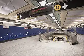 In mid-2013, work had resumed in the tunnel segment between 99th Street and 105th Street, involving the addition of track and signals, mechanical and plumbing equipment, and upgrading the tunnels to meet modern fire code standards.[51][52] As of November 2013, the station was 65% excavated. Rails for the line had arrived and were being stored in the station cavern;[53] about one-third of the rails for the line had arrived by then, enough for tracks to be laid from 105th to 87th Streets.[54] By spring 2014, the mezzanine was completed, and roof slabs were being installed; tracks and signal brackets were also installed north of the station.[55] By April 2015, the station was 67% complete,[56] and by April 2016, the station was 91% complete.[57] The station was scheduled to be completed by June 2016,[58] but this was later pushed back to fall 2016.[59]