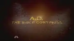 A.D. The Bible Continues (also known as A.D. Kingdom and Empire) is an American biblical drama television series, based on the Bible, and a sequel to the 2013 miniseries, The Bible, and follows up from the film Son of God which was a more in depth look on Jesus's story. It was produced by Roma Downey, Mark Burnett, and Richard Bedser.[1] The limited series began airing on NBC on Easter Sunday, April 5, 2015, in twelve weekly one-hour episodes. The story takes place immediately after the events of The Bible miniseries, and then of the Son of God film, beginning with the crucifixion and resurrection of Jesus, and continues with the first ten chapters of the Acts of the Apostles.[2][3] On July 3, 2015, NBC cancelled A.D. The Bible Continues after one season.