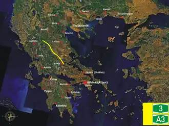 The A3 motorway, also known as the Central Greece motorway (Greek: Αυτοκινητόδρομος Κεντρικής Ελλάδας) or the E65 motorway,[1][2] is a partially completed controlled-access highway in Greece. It will link the A1 near Lamia with the A2 near Grevena, passing Karditsa, Trikala and Kalambaka. It will carry the European route E65.