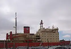 The Tandanor shipyard repaired the fire damage and also reconfigured the vessel to increase laboratory space from 74 m2 (800 sq ft) up to 415 m2 (4,470 sq ft). This allows the ship to be used primarily as a research vessel in addition to its role of resupplying the southernmost Antarctic base Belgrano II.[3] The diesel engines have been replaced by four new ones purchased from MAN in October 2011.[3][36][37] The main radar of Irízar was also repaired in Argentina by CITEDEF.[4] Work was initially estimated to be finished by November 2011,[38] but it was not until April 2017 that the icebreaker was declared seaworthy again.[39]