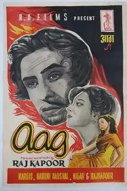 Aag (English: Fire) is a 1948 Indian Hindi language musical drama film which is produced, directed by and stars Raj Kapoor. The film marked the debut of Kapoor as producer and director and was the first film produced by his R.K. banner. Nargis, Premnath, Nigar Sultana and Kamini Kaushal also starred in supporting roles. Raj Kapoor's youngest brother Shashi Kapoor appeared as a child artist in this film playing the younger version of his character (Kewal). This marked the first of more than a dozen films in which Raj Kapoor and Nargis appeared together.