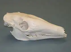 The greatly elongated head is set on a short, thick neck, and the end of the snout bears a disc, which houses the nostrils. It contains a thin but complete zygomatic arch.[22] The head of the aardvark contains many unique and different features. One of the most distinctive characteristics of the Tubulidentata is their teeth. Instead of having a pulp cavity, each tooth has a cluster of thin, hexagonal, upright, parallel tubes of vasodentin (a modified form of dentine), with individual pulp canals, held together by cementum.[16] The number of columns is dependent on the size of the tooth, with the largest having about 1,500.[13] The teeth have no enamel coating and are worn away and regrow continuously.[11] The aardvark is born with conventional incisors and canines at the front of the jaw, which fall out and are not replaced. Adult aardvarks have only cheek teeth at the back of the jaw, and have a dental formula of: 0.0.2-3.30.0.2.3 These remaining teeth are peg-like and rootless and are of unique composition.[28] The teeth consist of 14 upper and 12 lower jaw molars.[6] The nasal area of the aardvark is another unique area, as it contains ten nasal conchae, more than any other placental mammal.[16]