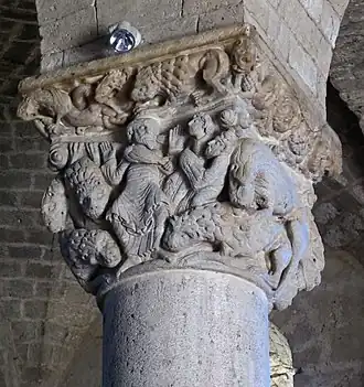 Notable is the so-called capital of "Daniel in the lions' den", work of the French Master of Cabestany. It shows Daniel praying between the hungry lions, and, on the other sides, the lions devouring the accusers.