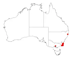 It is native to coastal areas of south eastern New South Wales and north western Victoria.[1] The range of the plant extends from around Bega in the north to around Howe Hill on the north eastern tip of the Victoria-New South Wales border in the south[4] in the far east Gippsland area.[3] It is commonly situated along creeks and streams in gullies or on low hillsides found near the margins of rainforest communities growing in moist sandy or shale-based soils and conglomerates.[4] It is often associated with Acacia longifolia.[6]