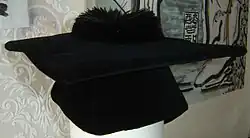The professorial Talar can be described as a long black gown with wide sleeves, often with lapels in faculty colour, while deans wear a Talar completely in faculty colour. Rectors typically have a distinguished, more elaborate Talar, e.g., made of velvet, coloured in red, or with gold embroidery.[14][15] At some universities, the rector additionally wears a chain of office and, at some occasions, carries a scepter.[16][17] The cap that accompanies the Talar is called Barett. As is the case with the Talar, which type of cap is used varies by university as well. Historically, caps made of soft materials rather than the square academic cap are common. The colour of the Barett matches the Talar.[15]