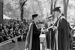 Academic regalia at McGill was traditionally differentiated in accordance with the wearer's status and degree.[8] Matriculating undergraduates had to attend classes in "plain, black stuff gown, not falling below the knee, with round sleeve cut above the elbow".[6] Graduating students for the bachelor's degree, on the other hand, wore robes falling below their knees with full sleeves cut to the elbow, and black hoods lined in silk which were edged with white rabbit fur. Master's degree candidates/holders wore the same black gown as the bachelor's, with the masters' sleeves appearing in semi-circular cut toward the bottom. Doctors of Philosophy (Ph.D.s), Science, Literature, and Civil Law wore the university's scarlet full dress. The doctoral full dress was the equivalent of the academic dress of the University of Cambridge for its higher doctorates, rather than for its Ph.D.s.[9] It was originally made of scarlet cloth, "faced with silk of the same colour as the lining of their respective hoods."[10] The turned-back, full sleeves of the McGill doctoral dress were also lined up with silk in the same colour that denoted the wearer's field of study. Doctorate and master's hoods were identical in form. They were distinguished from the bachelor hoods by the former's scarlet colour, greater length and absence of rabbit fur.[11] McGill University's official colour is scarlet.[12]