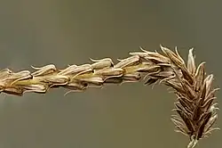 Fruits are elliptic utricules, 2.5 mm (0.098 in), held tightly against the stem, with tiny branch-shaped bracts that easily stick to clothing.[3][2][5][6]