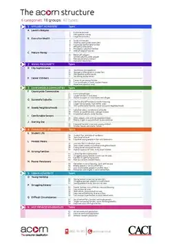 In March 2013, CACI launched the latest version of Acorn, although the necessary data from the 2011 census was not available for the whole of the UK. The current version of Acorn does not rely on census data,[1] but uses the new data environment created by government policies on Open data and the availability of a number of brand new private sector datasets. Peter Sleight, Chair of the Association of Census Distributors, considered Acorn's new version a sufficient improvement to have "revolutionised geodemographics". At The Census & Geodemographics Group's[2] decennial conference, Tracking a Decade of Changing Britain,[3] CACI presented a paper on the demographic segmentation.