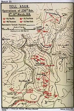 Infantry from the 74th (Yeomanry) Division's attack was made astride the Jerusalem to Nablus road; the 231st Brigade on the right moving towards Mezra ash Sherqiye 1.5 miles (2.4 km) north north west of Tell 'Asur. But the difficult night advance was further complicated by the terrain and Ottoman machine guns and despite reinforcements being brought forward, the infantry were held up later in the day by the cavernous gorge of the Wadi el Jib.[9]