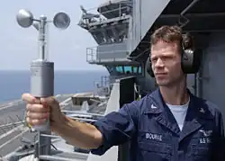 An aerographer's mate 3rd class uses a handheld anemometer to measure wind speed and direction aboard the aircraft carrier USS Dwight D. Eisenhower.