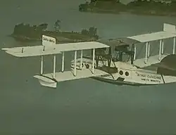 It was reorganized as Aeromarine Airways in spring of 1921 with Inglis Moore Uppercu, a New York City Cadillac dealer as its president. Aeromarine enjoyed many firsts - the first U.S. international air mail service and first scheduled U.S. international passenger service (Key West to Havana, November 1, 1920); first total-service U.S. airline (passenger, mail, express cargo); first in-flight movie (Chicago, August 1921); first airline baggage label (1921); and the first U.S. airline ticket office (Cleveland, July 1922).[5] Its slogan was "Speed Safety Comfort".[6] The overseas flights in Felixstowe F5L flying boats named the Nina, Pinta, and Santa Maria brought passengers to popular destinations that still allowed drinking at the start of Prohibition.[7] The new metal-hulled, six-passenger Aeromarine AMC was placed into service in 1924 but operated for only a short time before service ceased.[8]