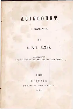 1. ^ a b c d e f g h i j k l m n o p q r s t u v w x y z aa ab James, George Payne Rainsford (1844). Agincourt. A Romance. Leipzig. OCLC 249669021.