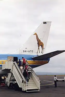 Air Tanzania was relaunched in September 2007 with two leased Boeing 737-200s in its fleet. The new brand represented the company's name, Mount Kilimanjaro and the airline's international destinations. The introduction of the airline's new logo on a leased Airbus A320 bore the image of the imposing giraffe – Tanzania's national icon, to replace the South African Airways flag symbol.[34][35] On 1 October 2007, the revamped Air Tanzania made its inaugural flight on the Dar es Salaam to Mwanza via Kilimanjaro route.[36]