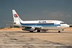 In June 1987 Air UK announced that it would start a new charter airline based at London Stansted Airport which would start operating in 1988 with two leased Boeing 737-200 aircraft.[1] The company Air UK (Leisure) Limited was formed in 1987 with Air UK providing 30% of the £2.5 million capital, B&C Holding (the parent company of Air UK) 30% with the rest from the travel group Viking International.[1]