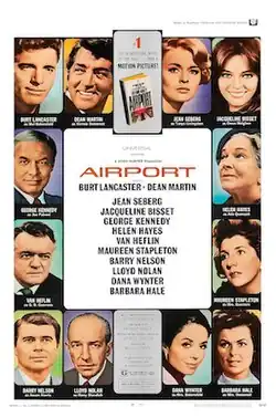 Airport is a 1970 American air disasterdrama film written and directed by George Seaton and starring Burt Lancaster and Dean Martin.[3] Based on Arthur Hailey's 1968 novel, it originated the 1970s disaster film genre.[4] It is also the first of four films in the Airport film series. Produced on a $10 million budget, it earned over $128 million. The supporting cast features Jean Seberg, Jacqueline Bisset, George Kennedy, Helen Hayes, Van Heflin, Maureen Stapleton, Barry Nelson, Lloyd Nolan, Dana Wynter and Barbara Hale.
