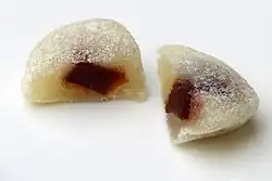 Aiwowo resembles snowballs in appearance. The outer skin is prepared by using glutinous rice rolling over steamed, hard flour. The filling could be any sweet materials, including sugar, sesame, apricots, plums, and yam. People often flatten it after filling. Sometimes, people also add hawthorn to the top of the snack to add a little sourness to its sweetness.[7]