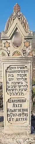 Akhso Ilyaguevna Shalumova (Russian: Ахсо Ильягуевна Шалумова; Hebrew: אחסו שלומובה; 1907–1985) was the first Soviet stage actress of the Judeo-Tat Theatre. For many years of creative work, in 1968, by Decree of the Presidium of the Supreme Council of the Dagestan ASSR, Akhso Shalumova was awarded the title of "Honored Artist of the Dagestan ASSR."[1][2][3]