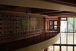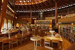 The Nakajima Library, named after founding president Mineo Nakajima, is open 24/7 every day.[16] The building's interior is made of locally-grown cedar wood and its half-dome shape is inspired by traditional Japanese parasols.[17] It has won a Japan Institute of Architects Award, a Good Design Award, and an International Architecture Award.[17]