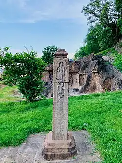 To the north of the lower caves is a small park. It contains inscribed pillars, a restored inscribed granite mandapa and recovered mutilated ruins found from nearby damaged temples. Of these, a notable pillar is the Kiratarjuna pillar with artwork and inscription clearly visible on all four sides. This pillar was on the hill side far up, close to the Kanaka Durga temple. It was moved here after 1950 to make room for infrastructure, preservation and the convenience of the visitors. The inscription on this pillar is from the 9th-century. It along with the panels recite the Hindu legend about Arjuna's yogic effort to gain the pasupata weapon from Shiva. This legend is found in its short form in the Mahabharata, and in the most extensive form in the Kiratarjuniya – a classic Sanskrit poetry by Bharavi.[9]