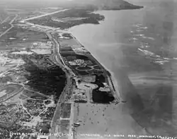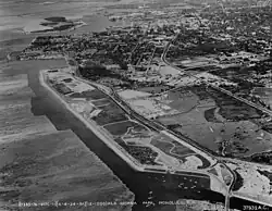 Originally named Moana Park, the Parks Board changed the park’s name to Ala Moana, “path [to the] sea” in 1947.[14][8] The beach was created in 1954. The deep swimming area fronting the beach is a former boat channel that was dredged through the coral reef in the late 1920s to join Kewalo Basin with the Ala Wai Harbor. In 1955, Hawaiian Dredging Company closed the west end of the channel with a landfill, now Kewalo Basin Park. Originally dredged for boat traffic, the channel is 20 to 30 feet deep and 1,000 yards long. From 1957 to 1961, concession stands and bathrooms were added. Henry Kaiser suggested the creation of a “magic island” of hotels, theaters, and swimming pools. The existing park would have been made into a parking lot.[15]