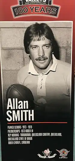 Allan Smith is an Australian former rugby league footballer who played in the 1970s and 1980s. Allan started his football career in Toowoomba playing for Valleys. Allan Smith played for the Queensland Maroons.