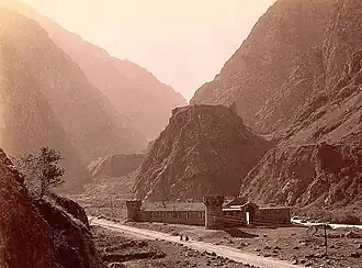 The Darial Gorge on a 19th-century photo by Alexander Roinashvili. On the hill behind the modern Russian fortress are the remains of the medieval border castle (sometimes called "Tamara's castle") separating Alania from Georgia.