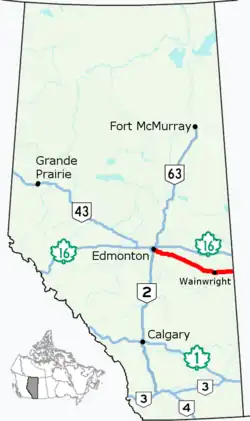 Highway 14 is an east-west highway in central Alberta, Canada. It stretches from Edmonton through Wainwright to the Alberta–Saskatchewan border, running parallel to the more northern Highway 16.[2] Highway 14 is about 257 kilometres (160 mi) long.