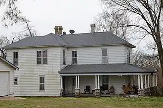 The Alden House is a historic house in a rural part of southern Bentonville, Arkansas. It stands in an agricultural area which lies on 0.75 miles (1.21 km) north and 0.4 miles (0.64 km) west of the community of Osage Mills. It is a 1+12-story wood-frame structure, most notable for a single-story porch, which wraps around three sides of the house. The main entrance is located in the beveled northwest corner of the building. The house, built in c. 1900 by the son of Philo Alden, a leading local farmer of the time, has a distinctive combination of Colonial Revival and Eastlake Victorian features.[2]