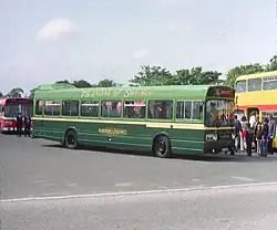Aldershot & District was inaugurated on 24 July 1912 when the British Automobile Traction Company Limited (a subsidiary of British Electric Traction Company - BET) bought the pioneering Aldershot & Farnborough Motor Omnibus Company Ltd, whose five buses had operated services between those two towns since 1906.[1] The initial livery was dark green and white, with the upper deck of double-deckers being a lighter green. Variations on a theme of two-tone green continued, later with cream relief replacing the white. The familiar looped fleetname was introduced in 1923 and lasted until 1968. In its early years, the company was also a general haulage contractor, operating a fleet of Foden steam lorries. In common with many other rural bus companies, it also carried parcels on its buses until the 1970s.[2]