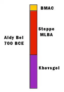 An admixture analysis suggested that Aldy Bel Scythians were of roughly 60% West Eurasian ancestry and 40% East Eurasian ancestry.[18]