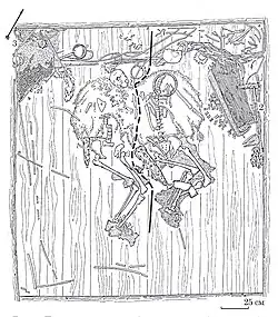 The kurgans contain mixed types of graves, with logs, stone boxes and dugouts. Burials are mostly solitary. The buried are laid in a crouched position, predominantly on the left side. The main burial is orientated with its head to the west, the others may somewhat deviate depending on their location in the kurgan. A typical feature is the deposition of horse harnesses at the side of the central burial pit, but in contrast with the Arzhan-period monuments there are as a rule no accompanying horse burials.[6]