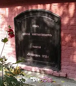 Aleksey Konstantinovich Tolstoy died on 28 September 1875, in Krasny Rog, Chernigov Governorate, after having given himself a lethal injection of morphine. He was buried in the family vault in the Uspenskaya Church in Krasny Rog.[2][7]