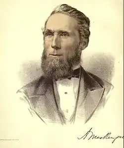 Mackenzie was born on January 28, 1822, in Logierait, Perthshire, Scotland, the son of Mary Stewart (Fleming) and Alexander Mackenzie Sr. (born 1784) who were married in 1817.[2] The site of his birthplace is known as Clais-'n-deoir (the Hollow of the Weeping), where families said their goodbyes as the convicted were led to nearby Gallows Hill. The house in which he was born was built by his father. He was the third of 10 boys, seven of whom survived infancy.[2] Alexander Mackenzie Sr. was a carpenter and ship's joiner who had to move around frequently for work after the end of the Napoleonic Wars in 1815. Mackenzie's father died on March 7, 1836, and at the age of 13, Alexander Mackenzie Jr. was thus forced to end his formal education to help support his family. He apprenticed as a stonemason and met his future wife, Helen Neil, in Irvine, where her father was also a stonemason.[2] The Neils were Baptist and shortly thereafter, Mackenzie converted from Presbyterianism to Baptist beliefs.[2] Together with the Neils, he immigrated to Canada in 1842 to seek a better life. Mackenzie's faith was to link him to the increasingly influential temperance cause, particularly strong in Canada West (Ontario) where he lived, a constituency of which he later represented in the House of Commons.[2]