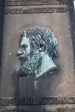 The inscription is: "Alexander Smith, poet and essayist. Born at Kilmarnock, 31st Dec. 1829; Died at Wardie, 5th Jan. 1867", and at the base it has carved 'Erected by some of his personal friends'.[9]