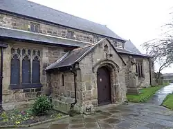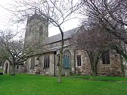 The church has Anglo-Saxon and Norman remains. The chancel is the oldest remaining part being of 14th-century origin. There is a south porch of 16th-century origin. The church is of a perpendicular style; the tower of two stages with a large red clock face and a two-light belfry window. The west face has a sculpture of the church's benefactor Sir Henry Vavasour.[1] The church is situated on ground raised from the road which is lawned and accommodated a small cemetery.