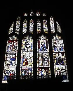 The church has much fine late medieval stained glass of around 1500,[3] now collected at the east end, except for small figures in the top of the tracery of some aisle windows. Some glass has been claimed to have come from the dissolved abbey at Basingwerk on the banks of the River Dee below Holywell. The church was also richly endowed by Thomas Stanley, 1st Earl of Derby, whose intervention at the Battle of Bosworth helped the Welsh-born Henry Tudor overcome Richard III in his successful quest for the throne of England. He paid for the large central east window, which survives almost complete; this reflects the dedication of the church with a host of figures of saints. A window with the Life of the Virgin in several scenes in the Lady Chapel is largely intact.[1]
