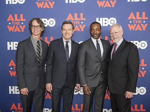 On July 16, 2014, it was announced that HBO Films had acquired the rights to the play All the Way with Robert Schenkkan writing the adaptation and Bryan Cranston reprising his role as Lyndon B. Johnson.[4] Schenkkan and producer Steven Spielberg agreed that the adaptation would differ significantly from the play. Schenkkan says, "When Steven, Bryan Cranston and I brought this to HBO, what I said at the time was, 'Look, I have no interest in just shooting the play. What I want to do is a complete cinematic reimagining of this story.' Everybody was on board for that. It's obviously recognizably the same story with many – but not all – of the same characters. I took a really hard look at how I could best tell this story on screen now that I had all the things that cinema brings that I did not have in my toolkit when I was working on stage."[5]