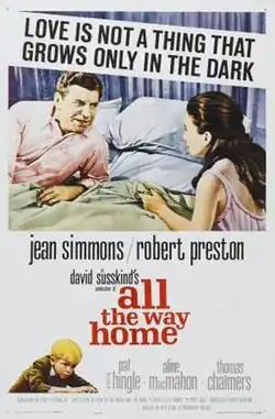 All the Way Home is a 1963 drama film directed by Alex Segal and starring Jean Simmons, Robert Preston, Pat Hingle, and Michael Kearney. The plot is about a young boy and his mother dealing with the sudden death of his father. It was based on the 1957 James Agee novel A Death in the Family,[3] and the 1960 Tad Mosel play All the Way Home.[4]