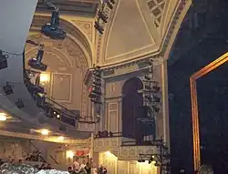 The balcony level is divided into front and rear sections by an aisle halfway across its depth. The walls of the balcony level are angled sideways to accommodate the theater's shape.[18] The side walls (near the boxes) are decorated in the Adam style, with fan shapes inside arches, which in turn are augmented by motifs such as swags.[18][19] The rear walls and the balcony's underside contain plasterwork paneling. The balcony's front rail contains Adam-style paneling and lights.[18] A smoking room and a mezzanine room adjoined the balcony level.[14]