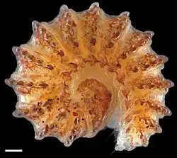 The genus Ammodesmus was named in 1896 by Orator F. Cook in the description of Ammodesmus granum. The genus was thought restricted to West Africa (Guinea, Liberia and Ivory Coast) until the 2015 description of A. congoensis from the Democratic Republic of the Congo. A. congoensis differs from the other two species in lacking ozopores (defensive glands), and has conspicuous sexual dimorphism, with females bearing sparse, long setae.[3] A. congoensis and A. granum are notable as the only two species in the order Polydesmida in which each sex can have 18 or 19 segments; intraspecific variation in segment number within sex is rare in this order.[3][1][4]